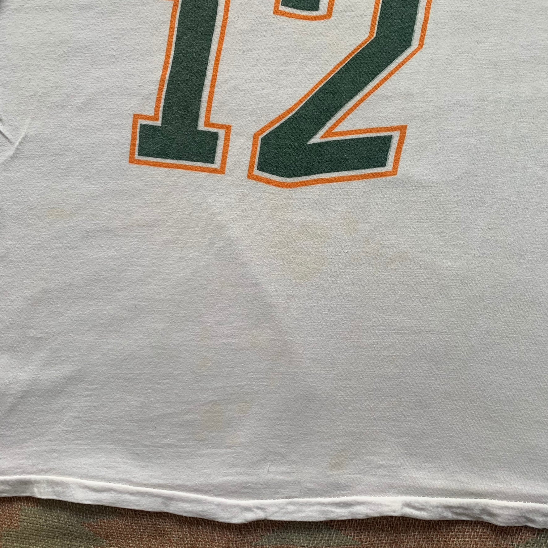 小さめですが、このくらいのサイズ感をぴちっと着るととっても可愛いです。大きすぎない「12」のプリントがいいですね。染み込みプリント。素材はコットンです。