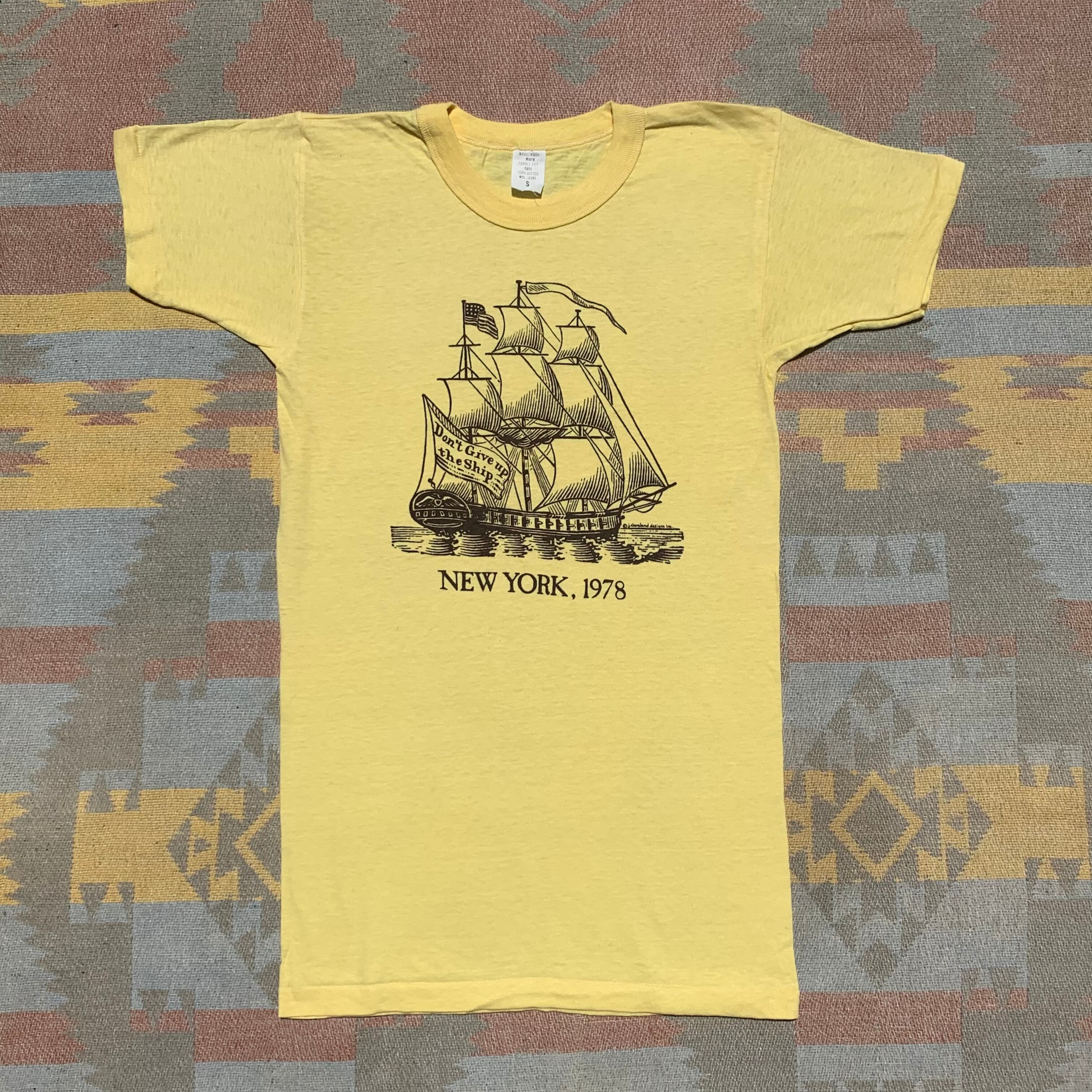 船のプリントが大人っぽくてかっこいいです。状態とても良いです。S表記ですが、レディースサイズのMくらいの大きさです。コットン素材で伸び縮みするので着やすいです。