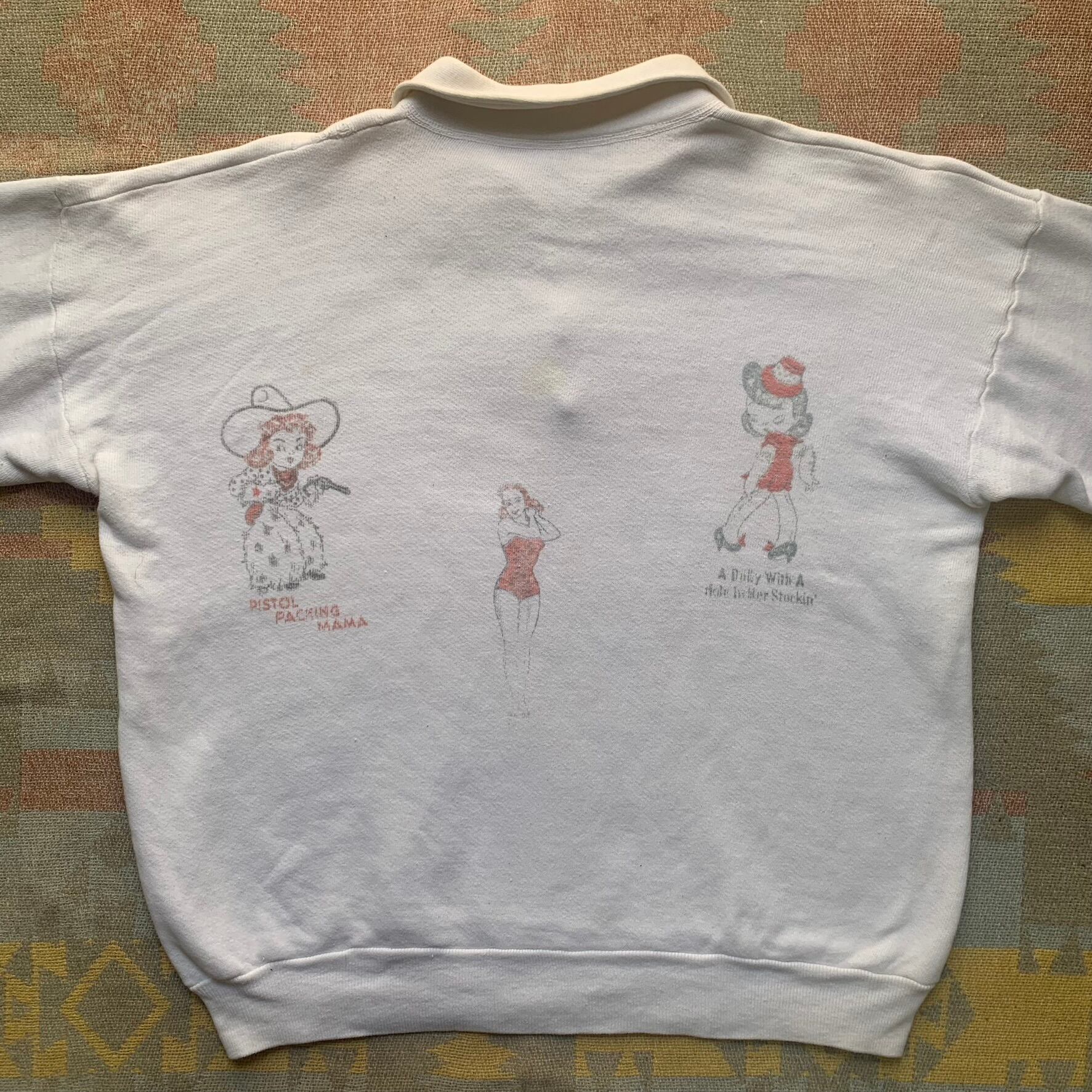 可愛い50sの転写プリントよハーフジップスウェットです。前後にプリントがあるのって贅沢ですよね。メンズでもレディースでも着れるサイズです。